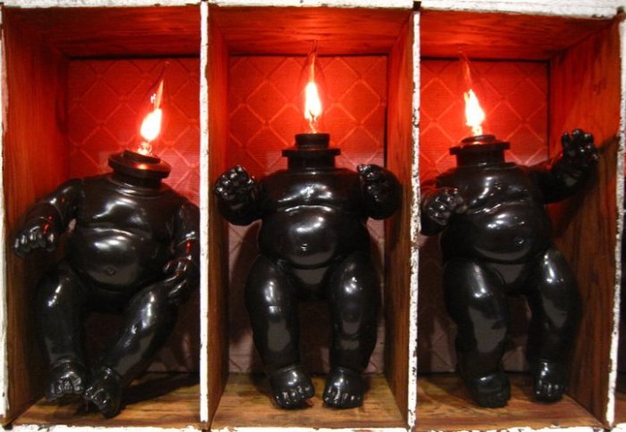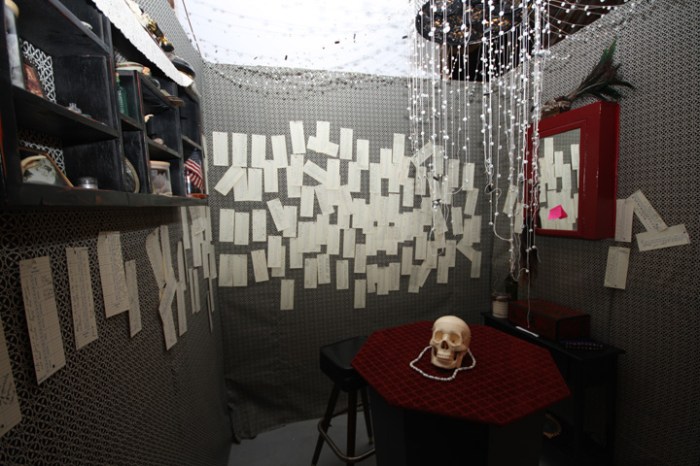 I call these The Thinking Caps. They’re top hats with mixed media. Each one has a hidden light